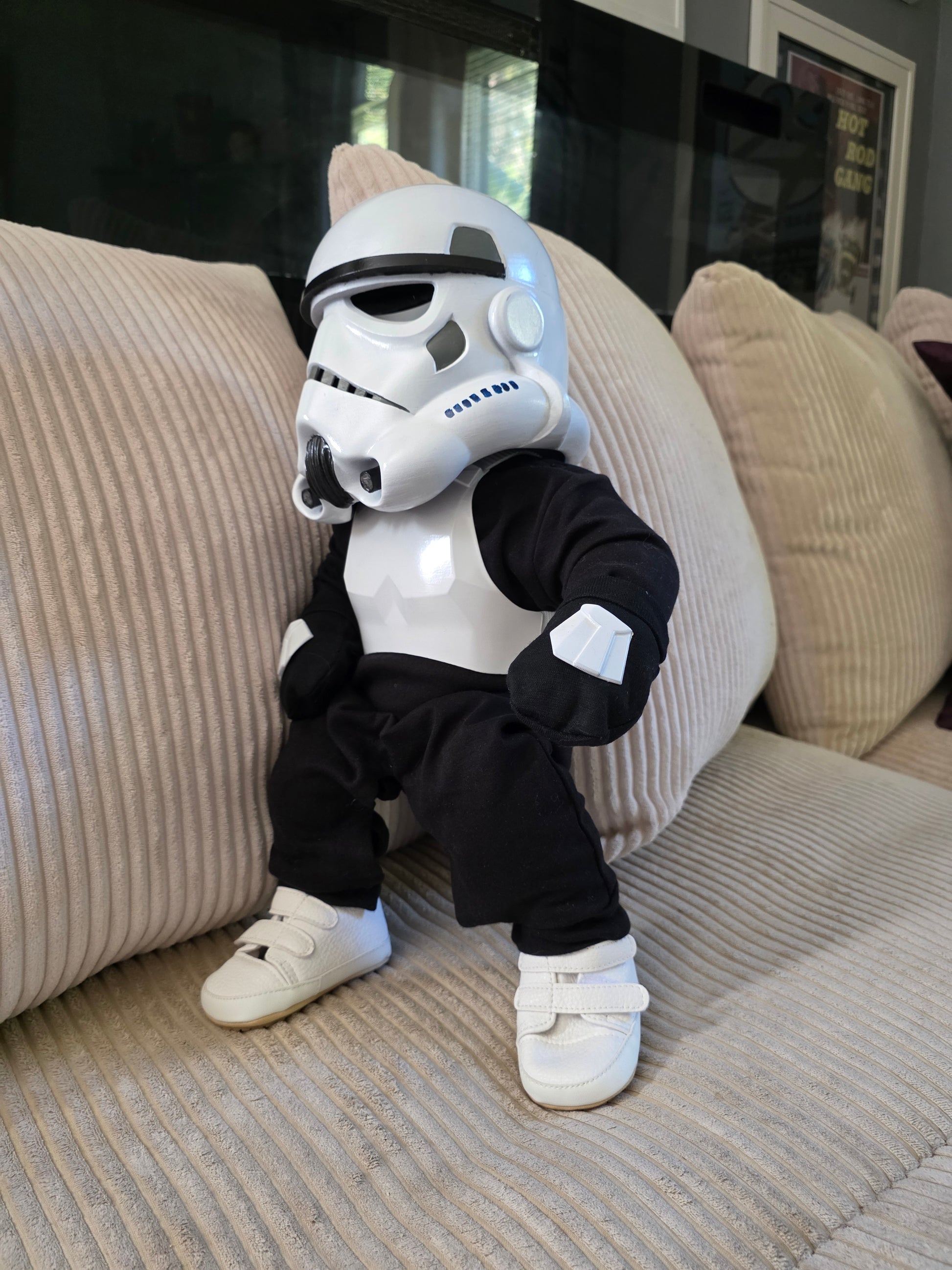 Everyone needs a Mini Me! This handcrafted doll is made by me based on a soft plush doll standing at 20 inches tall. Stormtrooper helmet, chest armor and hand armor are all 3D printed and painted. He also has a black cotton onesie and white baby shoes. He even has green tinted eye lenses just like you would with a real costume. His helmet is removable. I am working on the possibility of leg armor, but I haven't made any decisions to add that just yet.